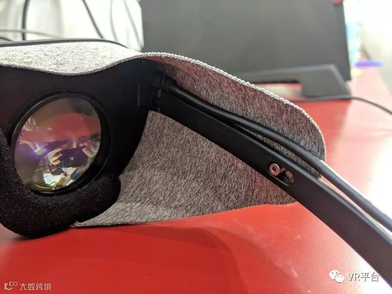 从现场实物来看,不同于宣传图里的是miniVR在侧面用做了防漏光设计,灰色布料材质透气,最重要的是足够轻便,且散热性极佳。眼镜右侧有一根线缆,连接与AMD合作开发的小霸王Z+新游戏电脑。