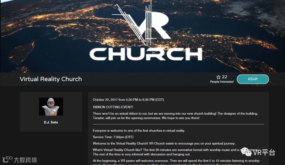 在他踏入AltSpaceVR两天后,Soto在那里发表了他的第一次VR布道,每隔几周也会主持一次传教。有时会吸引几十个人前来聆听,有时却空无一人。但Soto表示他并不介意,在过去的牧师生涯里,从未有过无神论者前来听教,但现在无神论者经常回来听他讲述来自上帝的爱。而在他第一次戴上VR头显的10个月后,Soto创立了首个完全以虚拟现实存在的VR教堂。