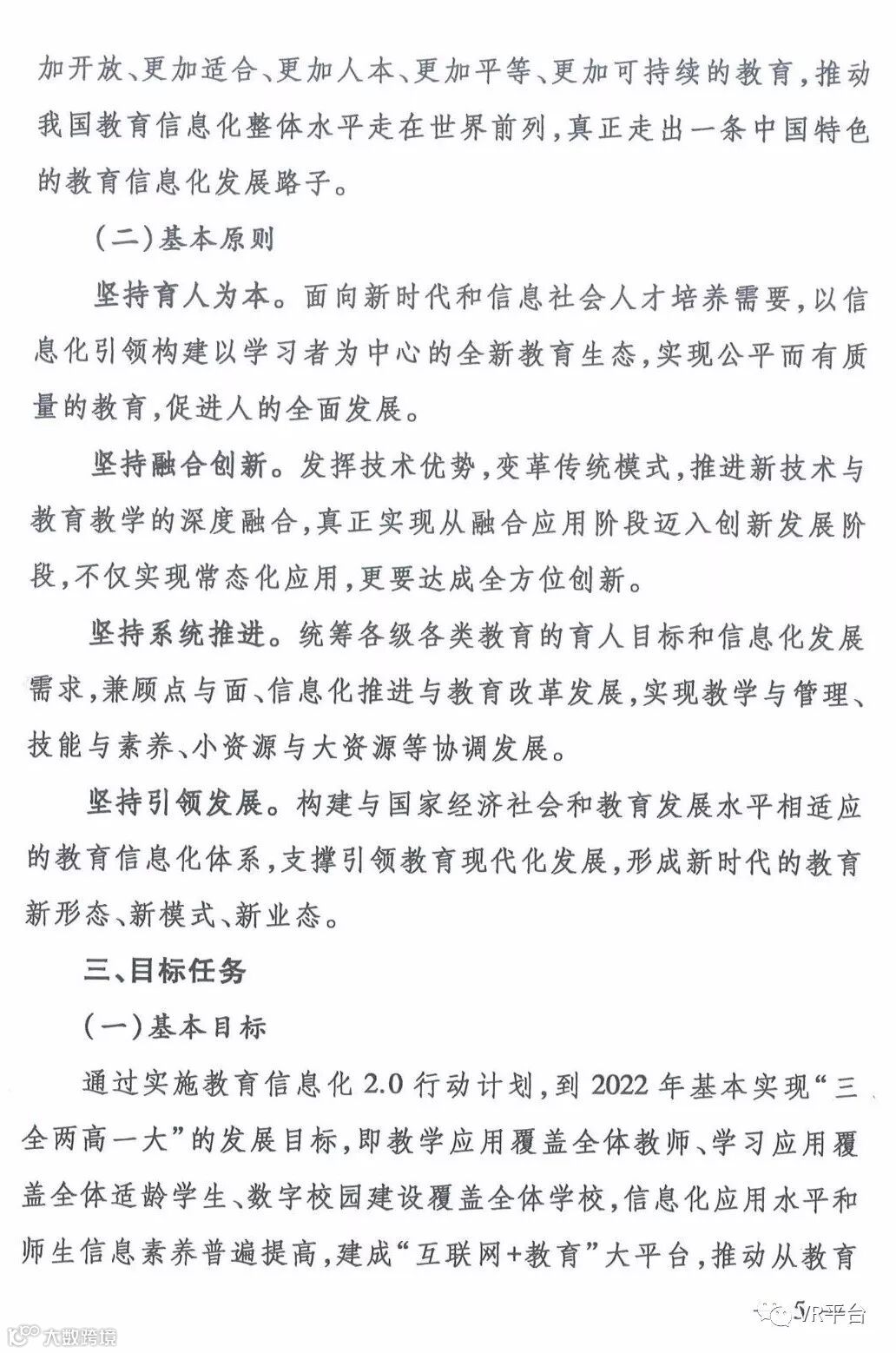 通过实施教育信息化2.0行动计划,到2022年基本实现“三全两高一大”的发展目标,即教学应用覆盖全体教师,学习应用覆盖全体适龄学生,数字校园建设覆盖全体学校,信息化应用水平和师生信息素养普遍提高,建成“互联网+教育”大平台,推动从教育专用资源向教育大资源转变、从提升师生信息技术应用能力向全面提升其信息素养转变、从融合应用向创新发展转变,努力构建“互联网+”条件下的人才培养新模式、发展基于互联网的教育服务新模式、探索信息时代教育治理新模式。