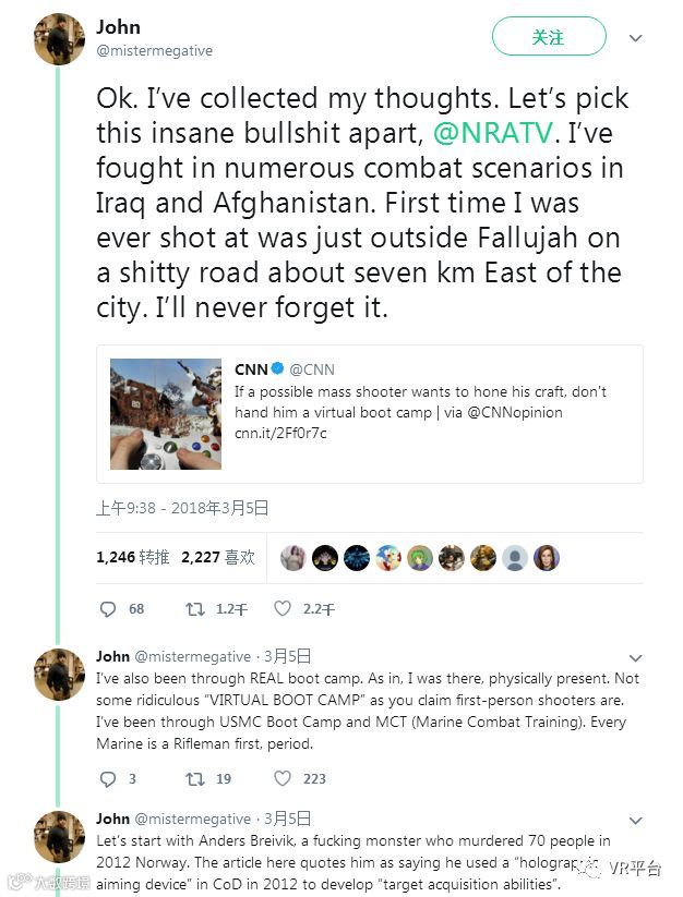 当然,这篇文章也遭到了很多反击。比如一名前美国海军陆战队员就在Twitter上发表了自己的见解: