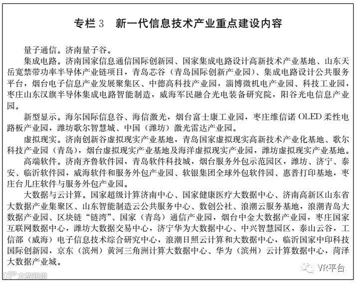 此外,该实施规划中表示要多点突破,以淄博等14市国家和省级经济技术开发区、高新技术产业开发区以及海关特殊监管区等为重点,创新园区管理运营机制,明确各市产业发展方向,培育特色经济和优势产业,打造若干具有核心竞争力的区域经济增长点。其中点名潍坊市将布局虚拟现实、人工智能、新能源电池等未来产业,壮大高端装备制造、生物基材料、信息技术、现代种业等新兴产业,改造装备制造、汽车、化工等传统产业,淘汰钢铁、造纸等行业落后产能,打造国家农业开放发展综合试验区、虚拟现实产业基地和国际动力城。