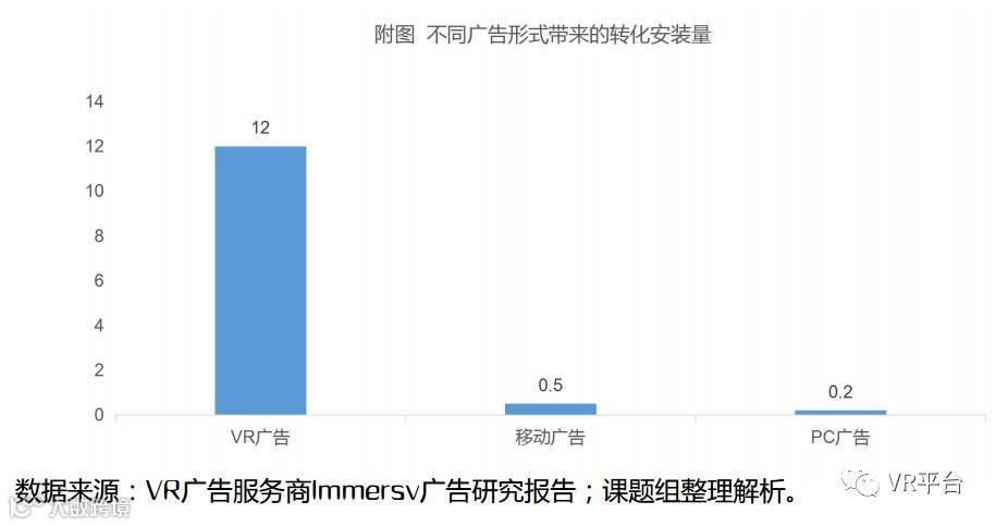 VR广告的转化率是移动广告的24倍。VR广告服务商Immersv广告研究报告指出,每1000个视频广告观看量,VR广告能带来12个新用户安装,相比而言,移动广告和桌面广告分别只能带来0.5和0.2个新安装。