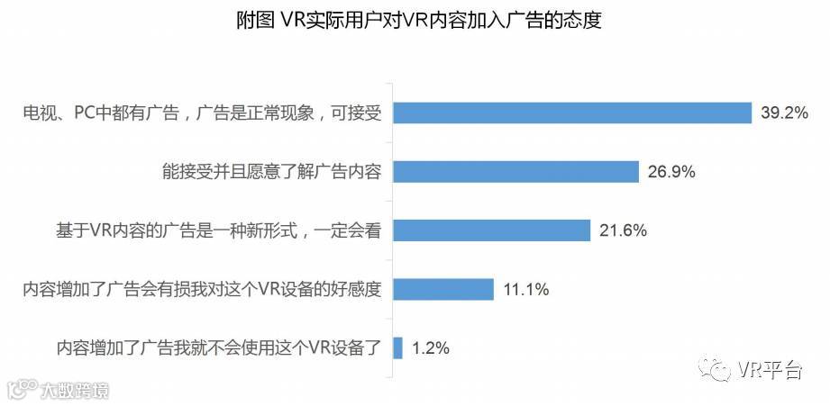 VR实际用户对于VR广告也抱有积极态度。调查显示,接近6成的用户对于现有的VR内容中加入广告持可接受态度,并不反感。可见VR广告在现阶段具有较好的效果,处于红利期。同时,有39.8%的用户表示沉浸式体验更有可能使之对产品感兴趣。