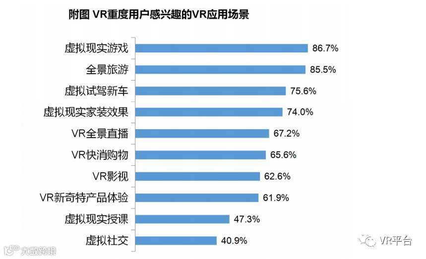 用户最感兴趣旅游、汽车、家装、游戏、体育直播等。调查显示,VR本身所具备的沉浸式体验和交互性等特征,使消费者对全景漫游经典,虚拟试驾,虚拟现实家装效果等场景更感兴趣。