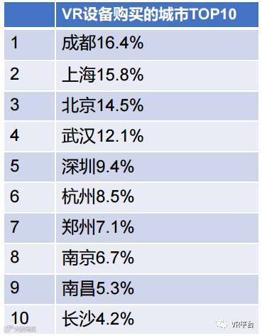 VR用户正在从一线城市向二三线城市快速渗透。调查显示VR用户主要分布在一二线城市,在东部其他城市蔓延分布,但是VR设备销售排名前十名的城市依次为成都、上海、北京、武汉、深圳、杭州、郑州、南京、南昌、长沙,呈现出向三线城市渗透的趋势。