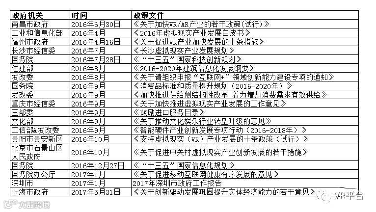 为抓住难得的发展机遇,美国、欧盟、日本等发达国家和地区纷纷推出扶持政策,加快VR技术创新与战略布局,力图抢占产业发展新的制高点。我国政府近年来也高度重视VR领域的发展,将VR技术放在超前发展战略位置,从中央到地方多次出台VR细化政策。