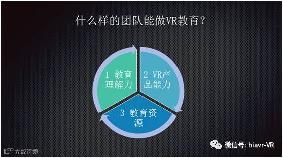 第一,是否有教育理解力。做VR教育要对目标学科和年龄层都有一定的认知,对于学科的知识点要清楚才能相应的针对学科痛点制作VR教育产品,此外,对于区域的教育政策也要了解,因为线下教育的区域性是非常强的。