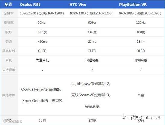 其中Oculus Rift和HTC Vive的单眼分辨率为1080*1200,而PlayStation VR的分辨率为单眼960*1080,前面两款产品要好于后者,就目前来说,视觉方面的体验占VR体验的很大一部分,所以就这点来看,Oculus Rift和HTC Vive要略胜一筹。