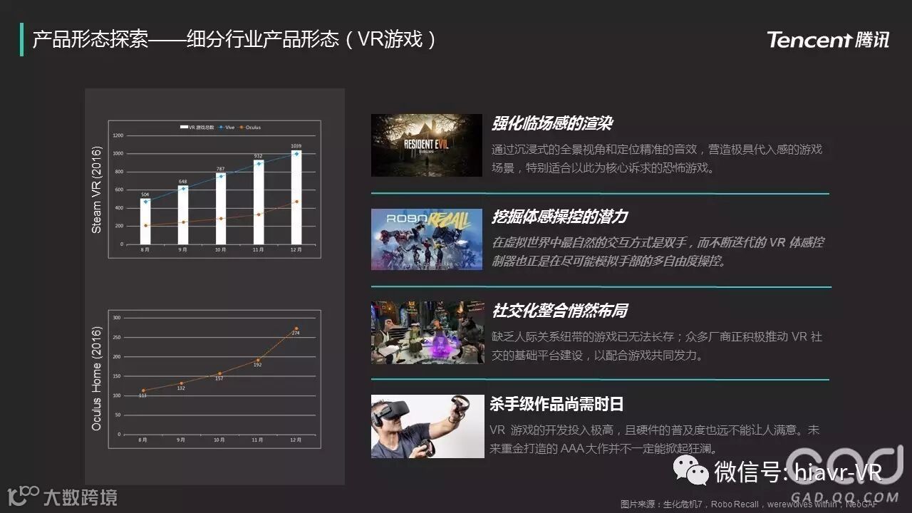 从Steam VR和Oculus Home这两个平台来看,VR游戏的产量正在稳步上升之中。白皮书还指出,VR游戏因为VR的沉浸感强烈的特点,特别适合开发恐怖类游戏。外加VR社交化正在布局,可以配合游戏共同发力,但是VR游戏也有自己的短板:VR游戏开发投入高,但硬件普及还不能让人满意,所以想要VR游戏掀起狂潮,不仅是杀手级的游戏应用的出现,更需要VR硬件设施的进一步发展。