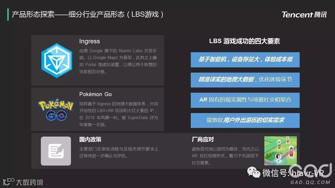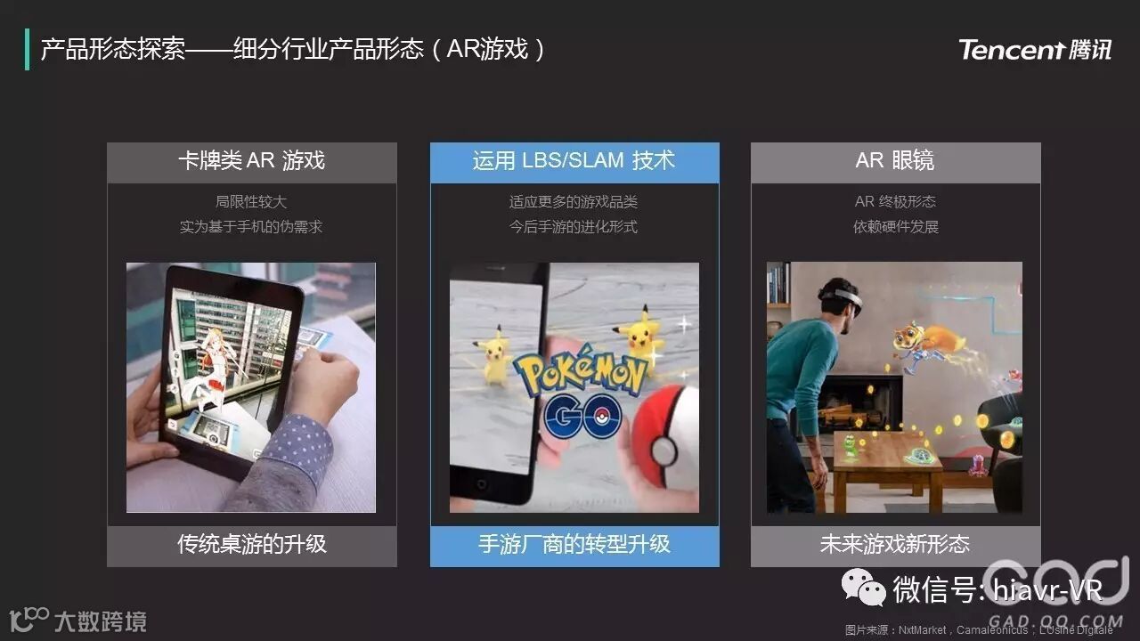 AR游戏中最具代表的应该是《Pokémon Go》,这是一种基于AR+LBS的玩法,也是AR游戏的一种分类,这种形式更适合手游厂商的转型升级。相比于VR游戏,AR游戏更加的移动化,轻量化,同时,因为AR技术的特性,AR游戏也可以与现实的天气、环境等因素结合,引申出更多的玩法。AR游戏的劣势则刚好建立在其优势之上,其移动化的特点让AR游戏大部分基于手机,这样因为手机的限制,无法体验高质量的AR游戏。所以,AR游戏的门槛技术也是比较高的。