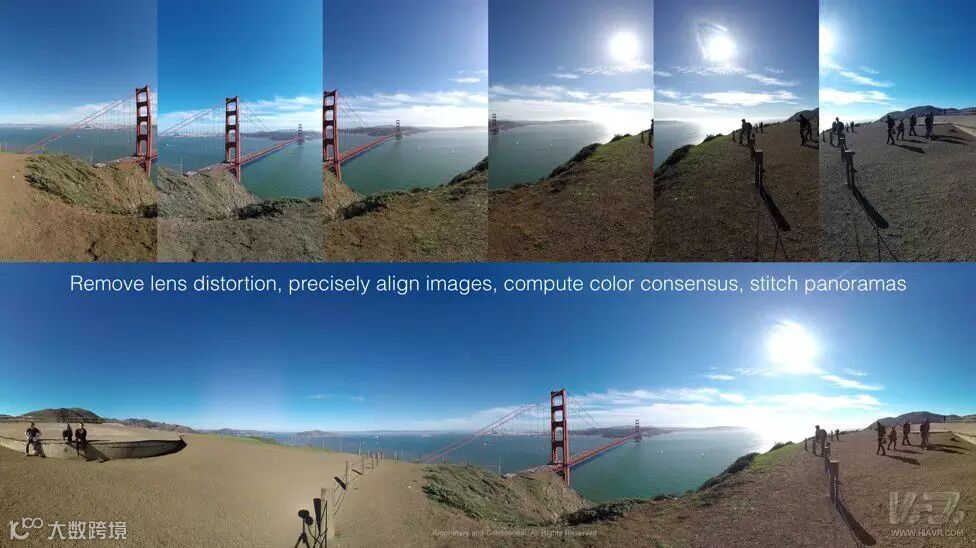 几何方式的拼接是目前大多数现成的拼接工具所使用的方法,比如Kolor Autopano,并且是在Jaunt的GP16相机上首次使用的拼接方法。使用这种方法,在拍摄时由镜头产生的每张图像中的桶形失真都会被修正,图像会根据其中的相似点来排列,然后被平滑地融合在一起。这种方法可以创作出完整的360°*180°展开状圆柱投影球形图像。