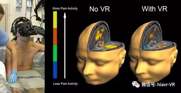 华盛顿大学德尔研究学者Hunter Hoffman和心理学教授DavidR. Patterson已经在各个年龄段的烧伤患者中使用沉浸式VR体验来控制疼痛感。他们使用的是一款开发于1996年的VR游戏《SnowWorld》,可以把病患带到一个模拟的被冰雪覆盖的峡谷中,使用者可以互相扔雪球,以此来分散对病痛的注意力。这个位于华盛顿大学HITLab的项目是与Harborview烧伤治疗中心合作的,这也是首个为了减少病痛而开发的沉浸式VR体验。