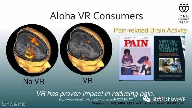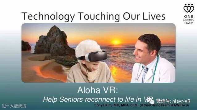 One Caring Team的研究成果名叫Aloha VR。这是一个“为老年人而设计的,满足他们未获得满足的精神需求”的产品。Kim说道。“Aloha VR已经帮助了很多感觉想要重新回归生活的病患。甚至有些最难治疗的老年痴呆症患者...也已经从我们的项目中获益。”