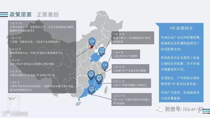 近日,由腾讯互娱推出了一份关于2017年Q1季度的VR行业全景热度观察报告。从《报告》中我们可以看出,国家针对VR的政策扶持还是占有一部分的,主要的的政策分布在北京、上海、山东、江西、福建、广州几个省份。同时也在逐步规范行业的各类准则。相信在接下来的时间里,国内的VR行业也将变得越来越有序。