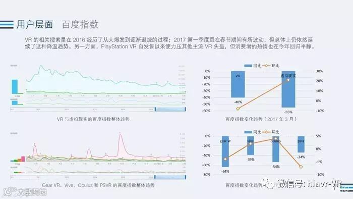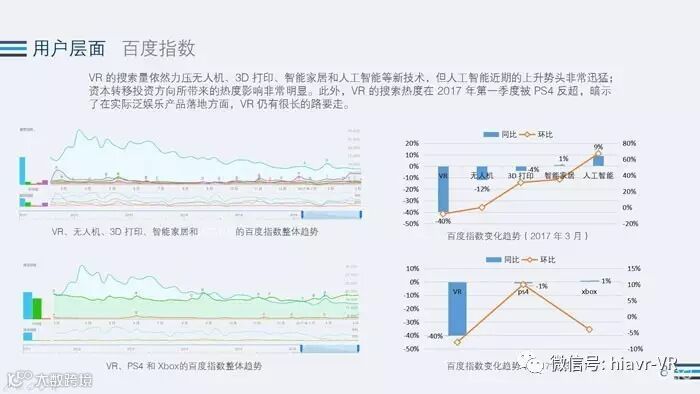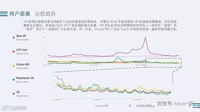 在用户层面上,在《报告》中我们看到,VR经过了16年的爆发,现在已经趋于冷静,但是VR的搜索依旧领先与其他科技。虽然第一季度被PS4反超,但是,PS4也是PS VR的载体,这些都是潜在有可能会转化成为VR用户的存在。