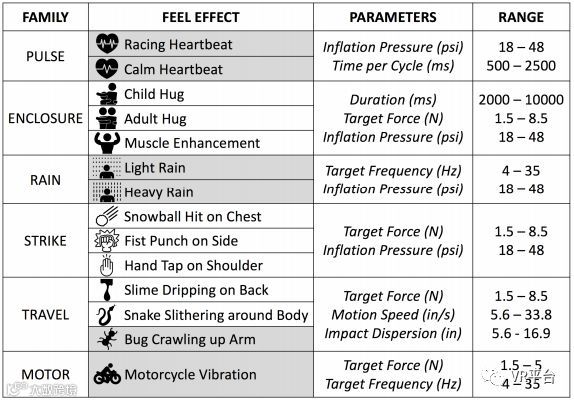 速度,力量,膨胀和紧缩都可以可以使用触觉效果软件编辑器来控制。来自迪士尼、麻省理工学院和卡内基梅隆大学的研究人员在他们的论文中写道:“在这个阶段的工作中,我们的目标是开发出能够满足基本心理预期,并且能测试初始效果的力反馈的核心技术。”到目前为止,这些效应包括:心跳加速,小或大雨,雪球击中胸部,手轻拍肩膀,黏液滴在你的背上,虫子爬上你的手臂,摩托车振动等。还有进一步的细化参数,比如控制虫子爬行速度的感觉。