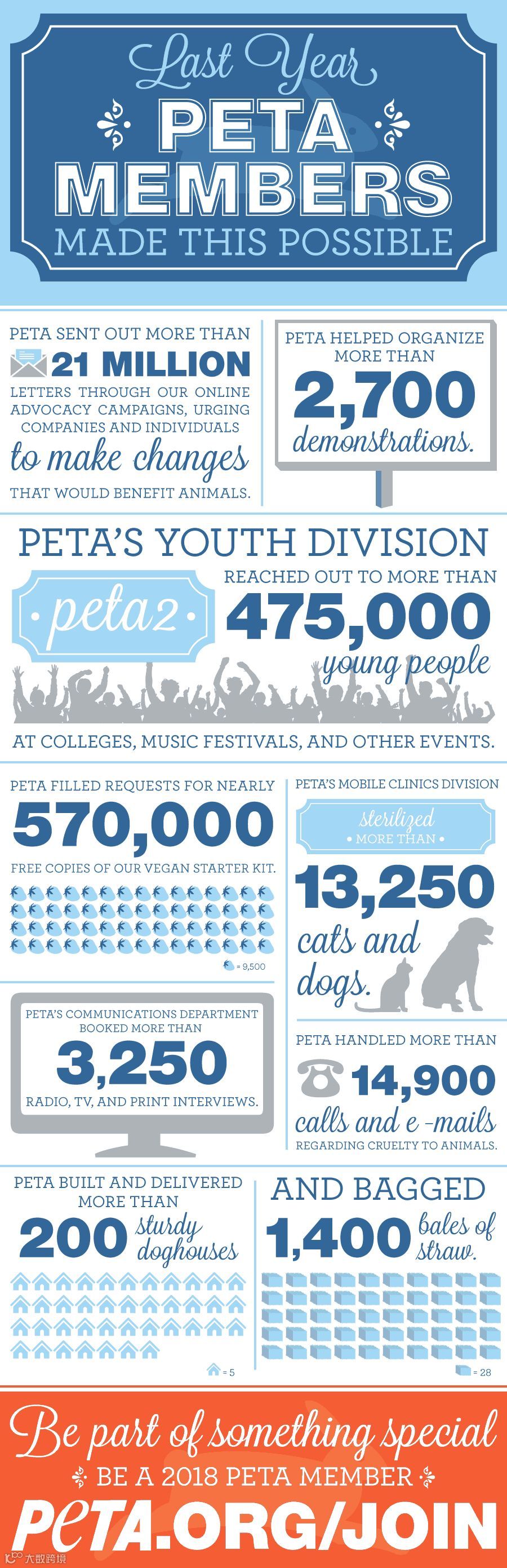PETA是世界上现存规模最大的动物权利保护组织,其活跃成员和支持者超过650万人,遍布全球各地。据善待动物组织的移动诊所部门称,2017年这个庞大的组织仅在推广项目上就花费了57325933美元,在这个过程中他们还在为13250只猫和狗进行了绝育手术。