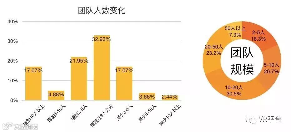 2017年,虽然VR内容团队以小团队为主,但仍然有近一半的团队都在一定程度上扩大了团队规模,在行业内开始稳步发展。