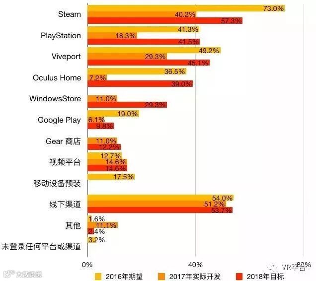 在内容平台方面,Steam平台的上线占比与期望均大幅降低,或有Steam上内容数量众多、容易被盗版、收益率低等原因。此外,Viveport、PlayStation、Oculus Home等线上平台实际上线情况均不如2016年底的期望,但在2018年仍有很强的上线意愿。Windows Store的上线意愿进一步提升,成为最为突出的增长项。线下平台状况则基本稳定。
