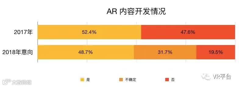 2017年,已经有超过半数团队尝试过开发AR内容,其中大部分来自于B端订单。在2018年,可能会有更多团队进入AR内容领域,只有不足1/5的团队明确表示不会尝试 AR内容。