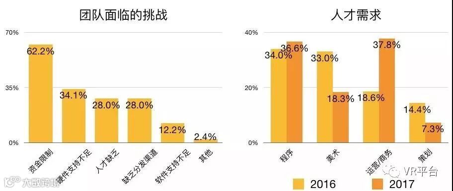 对VR内容团队来说,资金的限制依然是最主要的问题,超过6成团队认为资金问题是团队面临的重要挑战之一。这也造成了内容开发者更多地向B端倾斜,同时带来了对商务/运营人员需求的提升。