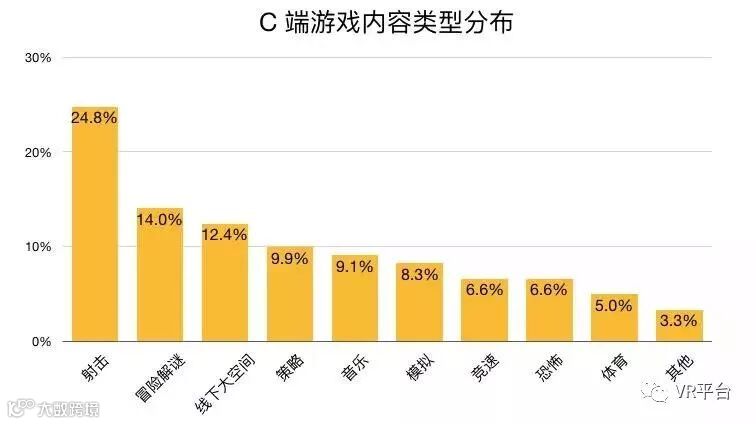 游戏依然是C端内容的主力,有近6成的团队研发游戏内容。在诸多游戏内容类型中,射击类游戏继续保持了绝对主流的地位。同时,线下大空间内容的占比已经达到12.4%,已经成为一个非常重要的游戏类别。