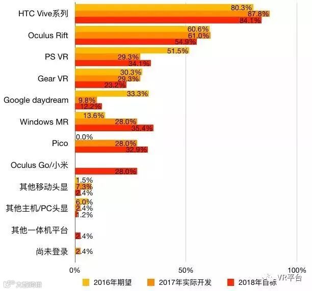头显设备方面,HTC Vive 系产品依然处于领先地位,PSVR 和 Daydream 的实际开发占比和新一年的开发期望都大幅降低,Windows MR 系列头显的开发意愿则持续走高。Pico 成为2017年的黑马,在开发者中获得巨大支持,其在 B 端市场的成功功不可没。