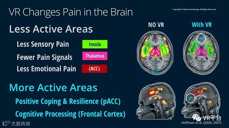 在对健康的志愿者所进行的研究中,功能磁共振脑部扫描展示了体验VR时,痛感相关脑部活动的大幅降低,这正是VR缓解疼痛的客观证据。目前,Patterson和Shriners医院心理和精神病科总监Walter Meyer医学博士已经成为美国国立卫生研究院的主要研究员,他们正在探索使用《SnowWorld》来减少操作性疼痛。研究样本则是Shriners医院的超大面积严重烧伤的儿童患者群体。研究人员正在测试VR技术对伤口清理过程的影响,并且预计将在2019年年中完成这项研究。