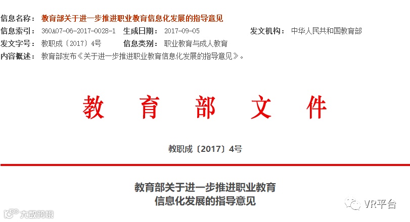 VR网(微信公众号:VR平台)编辑得知,教育部在近日印发《教育部关于进一步推进职业教育信息化发展的指导意见》,文件中指出,“十二五”以来,职业教育信息化发展取得了较大的进展。职业教育信息化的战略部署初步形成,基础设施建设进一步加强,管理规范和技术标准不断健全,数字教育资源开发和应用持续深入,教育资源和教育管理平台建设扎实推进,教师信息化意识与能力显著增强。