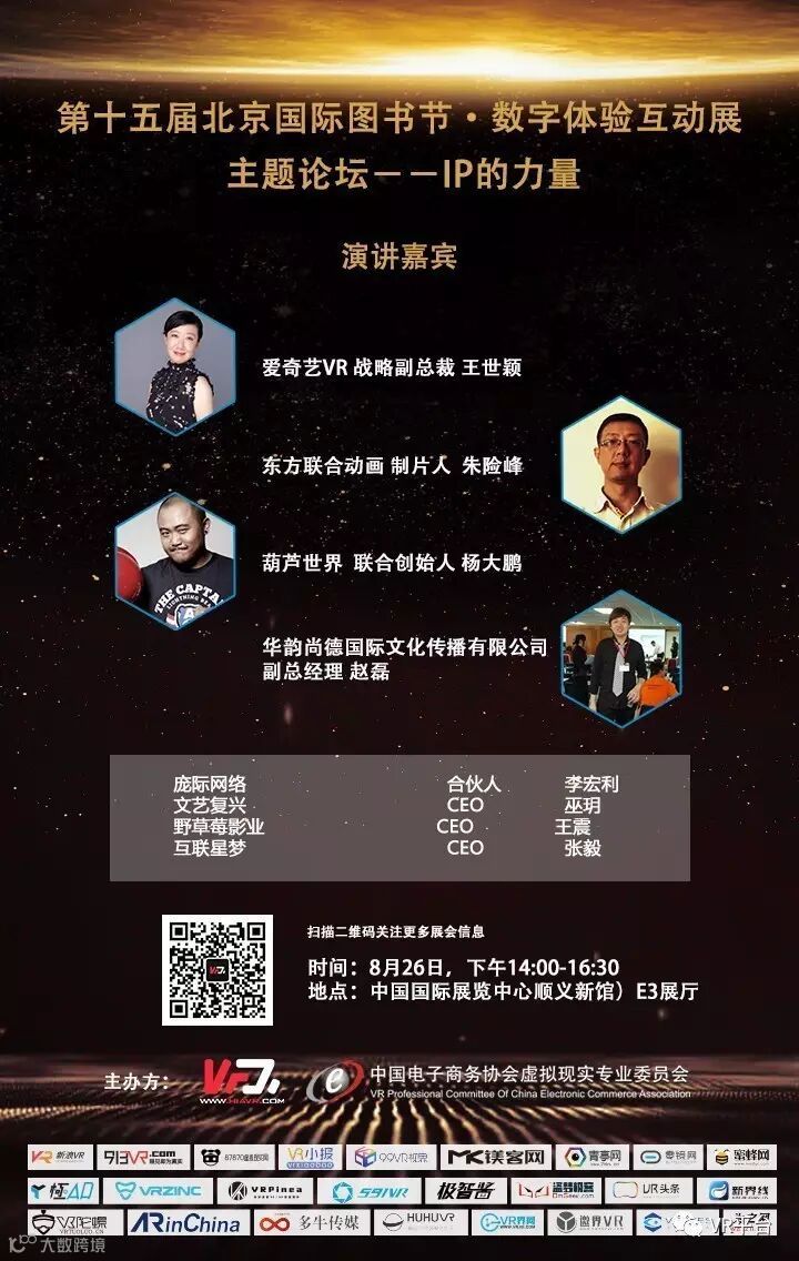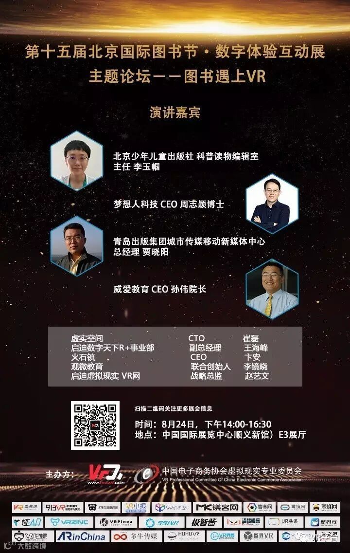在北京国际图书节的第二天,即8月24日下午,VR网将和中国电子商务协会虚拟现实专业委员会联合举办“图书遇上VR”专题论坛沙龙活动。