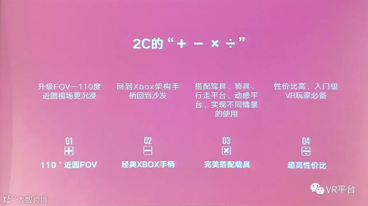 另一款新产品,蚁视VR头盔2C主打沙发级应用,独创了Xbox手柄新玩法,用Xbox手柄模拟VR操作,使用户坐在沙发上通过蚁视大厅就可以畅玩更多Steam平台VR游戏。在硬件参数上,蚁视VR头盔2C的FOV和蚁视VR套装2S一样,升级为110度近圆视场,此外蚁视VR头盔2C还瞄准了B端市场,可以与驾具、骑具、行走平台、动感平台等载具搭配使用,打造不同的情景模拟,可谓是B端C端两手抓。