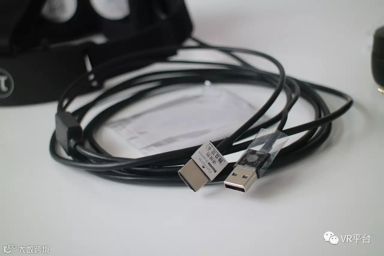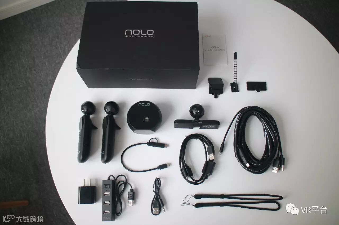 Step 2:将NOLO定位器与电脑主机相连。NOLO开箱时候小编就有些凌乱,各种线太多了,但其实使用过程中你会发现,只用得上这最粗的长度4米的一根(下图中最右边的一根线)。将这根线USB接口一端接入电脑,另一端与NOLO定位器相连。如果觉得两根线影响使用,造成不便,可以将这两根线固定在一起。