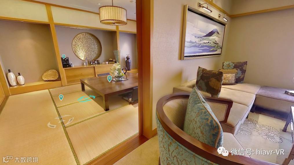 在专访一开始,高翔向VR网编辑展示了上海和平饭店日本套房的三维重建项目。除了可以在浏览器中通过点击来切换视角之外,还可以使用VR眼镜在其中漫游。可能你觉得这与普通的全景拍摄作品没有什么不同,但仔细观察可以发现,场景中是包含三维信息的,比如导航图标在不同的物体表面经过时,会随之发生变化,与仅呈现平面信息的全景拍摄作品截然不同。