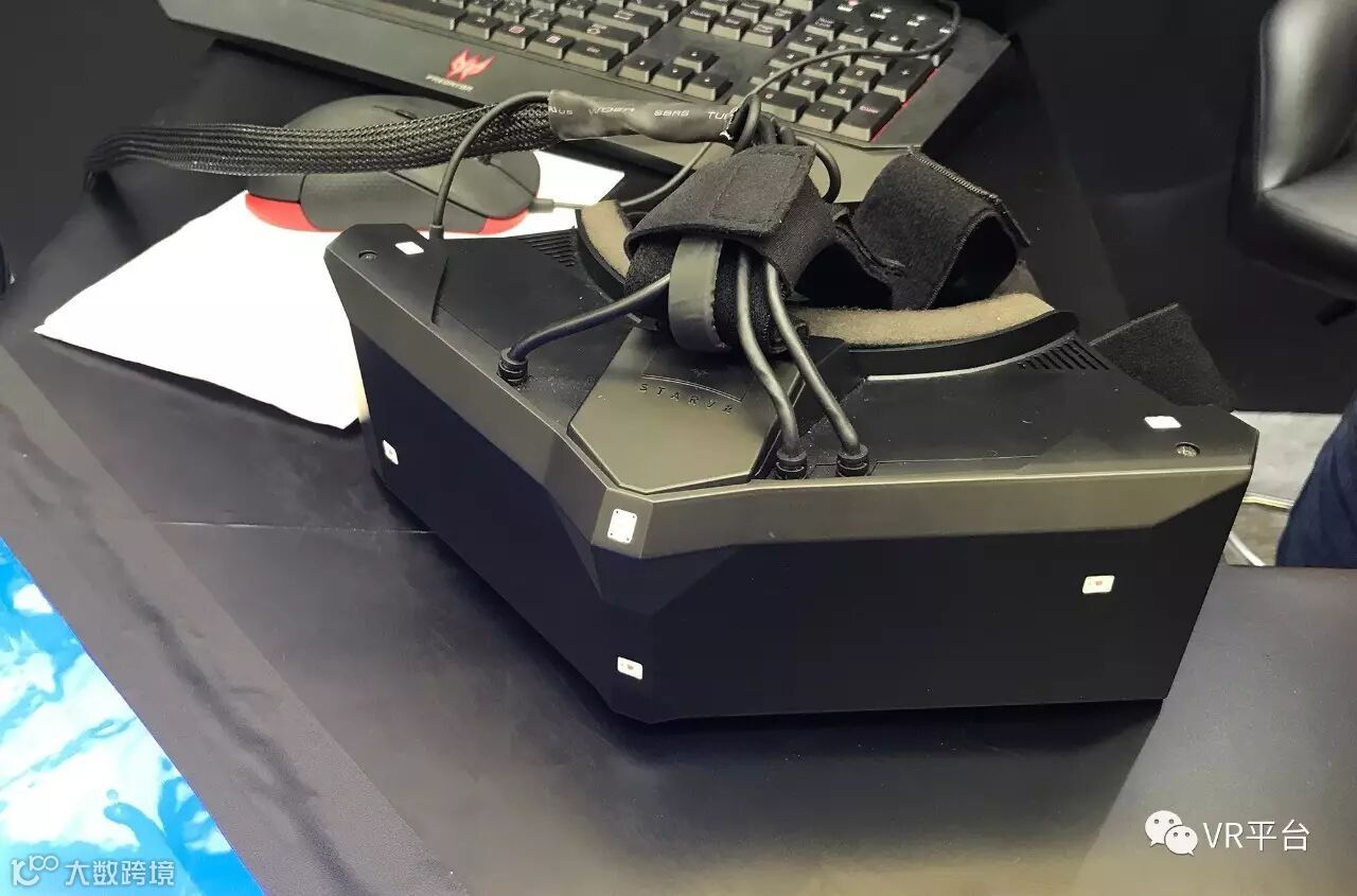 这就是摆在展台前的StarVR头显,除了比一般的头显要稍微重一些之外,还要拖着一大捆线缆。工作人员细心耐心以及贴心地帮我佩戴头显,让我完全没有机会亲自体会下头显的大概重量。在佩戴StarVR头显时,还是能感觉出比Vive要重一些。