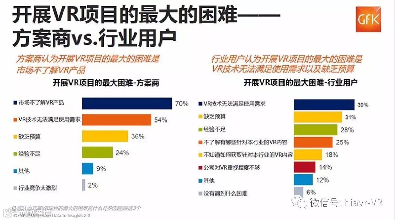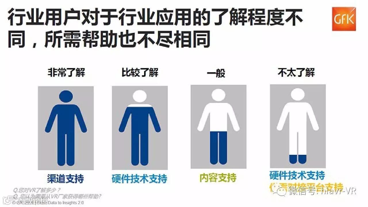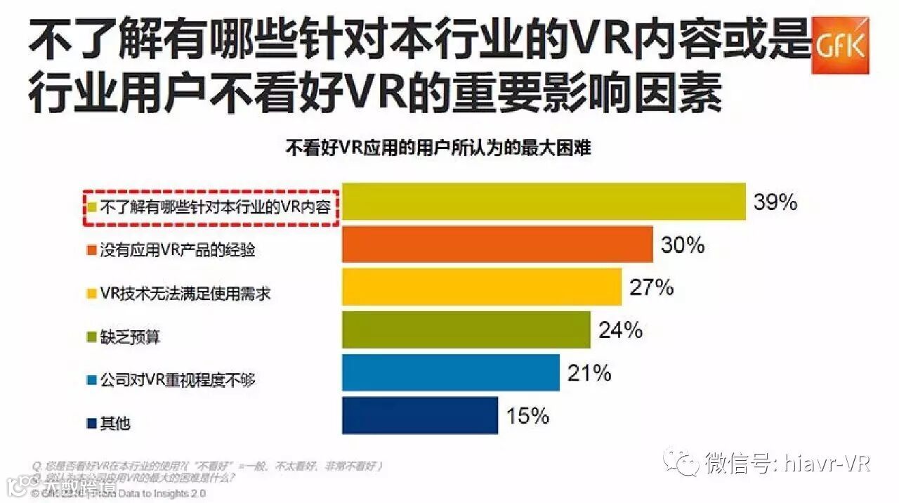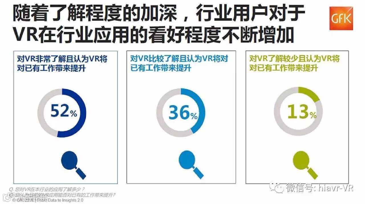 一些行业用户在深入了解的VR过程中,越来越看好VR行业应用;而一些不看好VR应用的行业用户认为自己根本不知道有什么针对本行业的VR内容。从根本上讲,这些不看好VR应用的行业用户就是对VR行业所知甚少,渠道不通,信息接收少。所以对本行业的VR内容不了解,不看好VR应用。