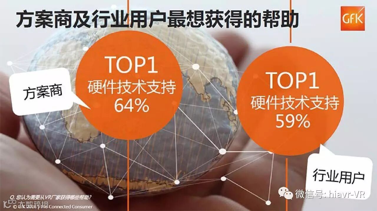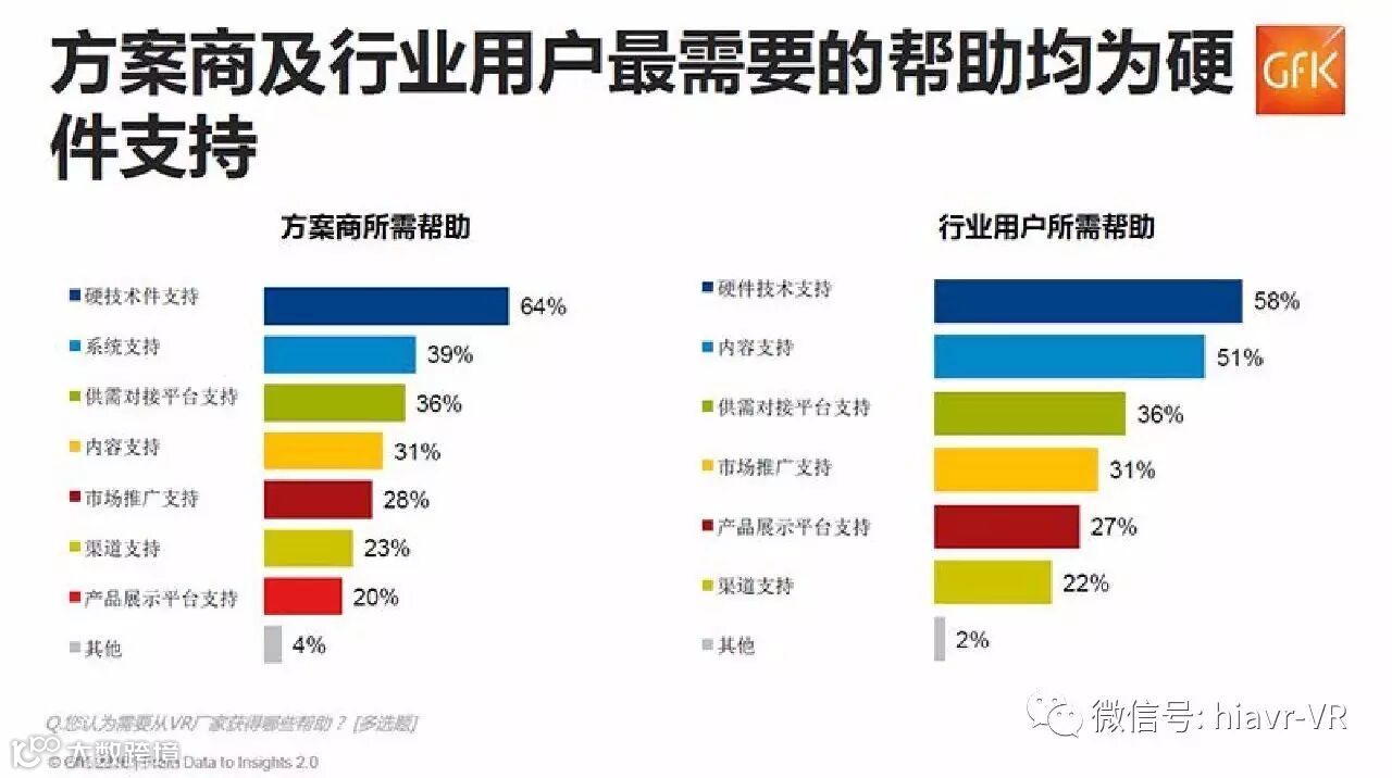 针对方案商和行业用户,因为站位不同,二者的观点也不同。方案商认为开展VR项目的最大问题是市场不了解VR产品;相反的,行业用户则认为最困难的是VR技术无法满足使用需求。但是在寻求硬件支持当面,二者达成了共识。