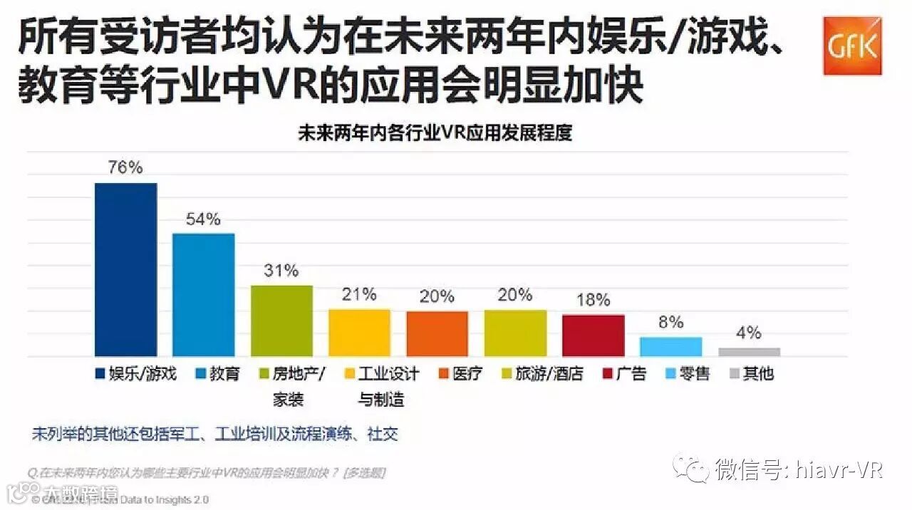 目前为止,整个VR应用领域以娱乐和教育为主,在所有接受调查的人中,大部分人认为未来两年内,娱乐/游戏和教育等行业的发展会明显变快。在此值得一提的是大多数接受调查者对VR行业的应用都是持积极的态度,对VR行业发展也是十分乐观。
