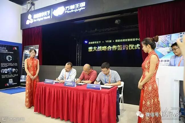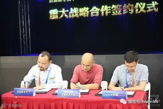 在双方与会人员见证下,由国家动漫创意研发中心肖永亮教授、启迪数字天下总裁王宣、副总裁兼VR网CEO刘勇代表进行协议签署。