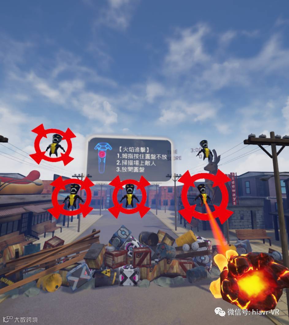 火焰人关卡属于FPS游戏,游戏为玩家共设置了3种攻击方式,第一种是直接火球攻击,瞄准扣动扳机即可;第二种是蓄力攻击,瞄准后长按扳机键,当火球变成了蓝色则蓄力完成,松开扳机键攻击;第三种则是使用触摸盘对敌人逐一进行锁定,松开圆盘后同时攻击锁定目标。根据游戏过程中实际情况采用合适的攻击方式,打出更多的连击,分数会更高。