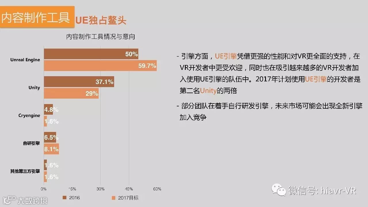 -引擎方面,UE引擎凭借更强的性能和对VR更全面的支持,在VR开发者中更受欢迎,同时也在吸引越来越多的VR开发者加入使用UE引擎的队伍中。2017年计划使用UE引擎的开发者是第二名Unity的两倍