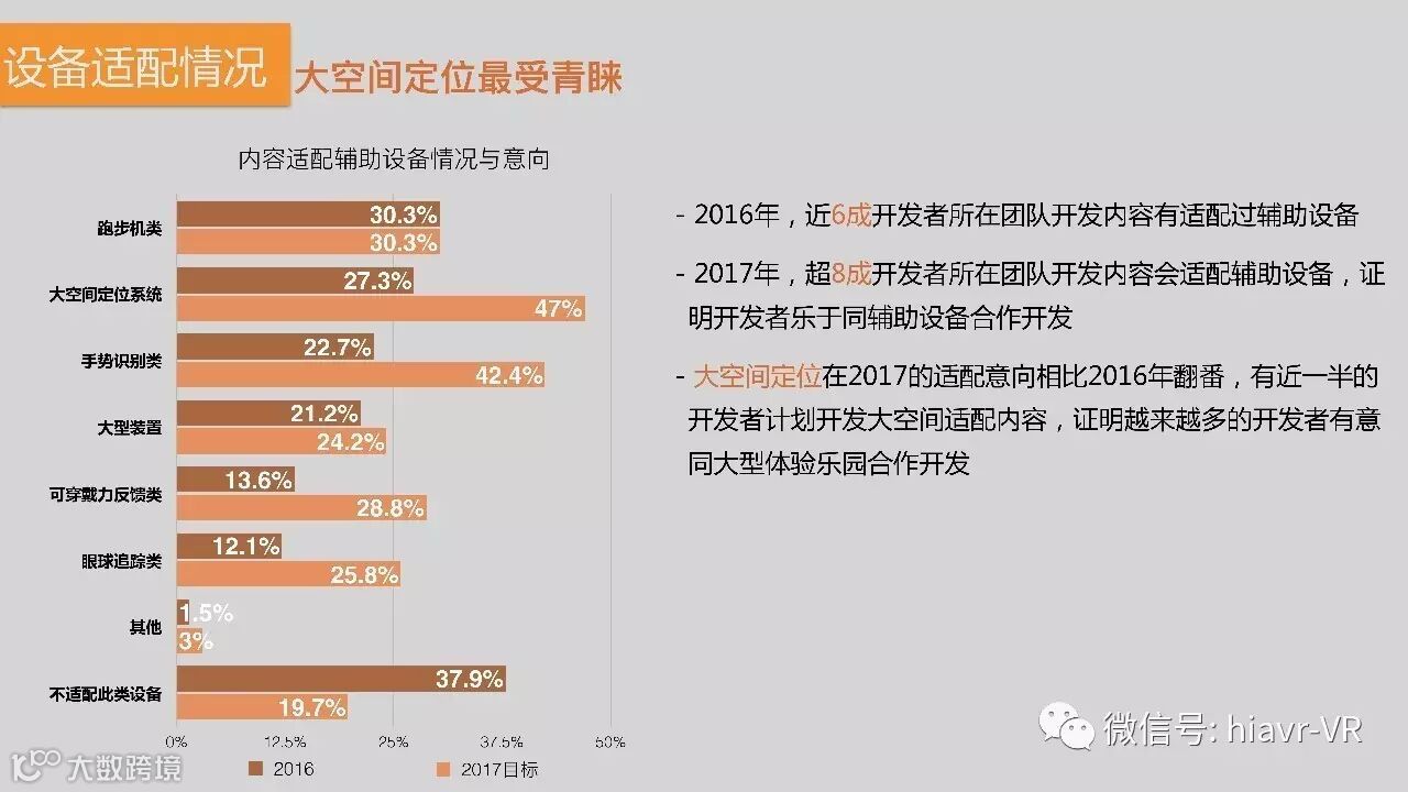 -大空间定位在2017的适配意向相比2016年翻番,有近一半的开发者计划开发大空间适配内容,证明越来越多的开发者有意同大型体验乐园合作开发