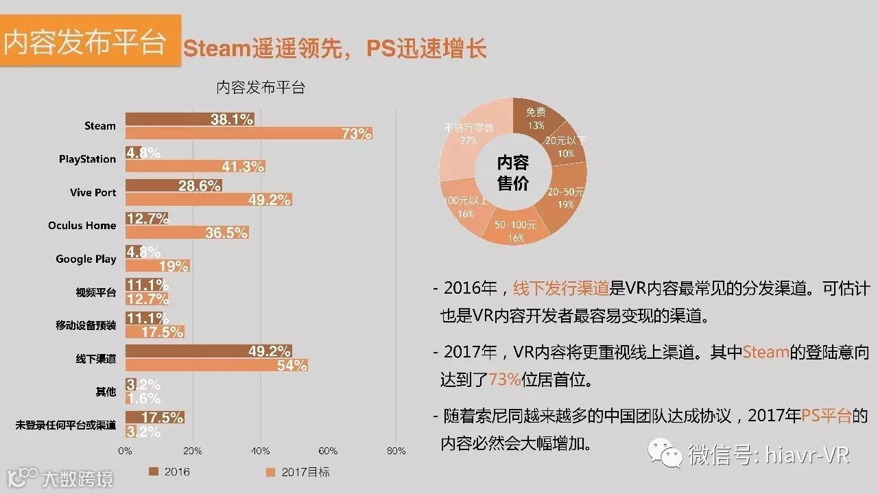 -2017年,VR内容将更重视线上渠道。其中Steam的登陆意向达到了73%位居首位。