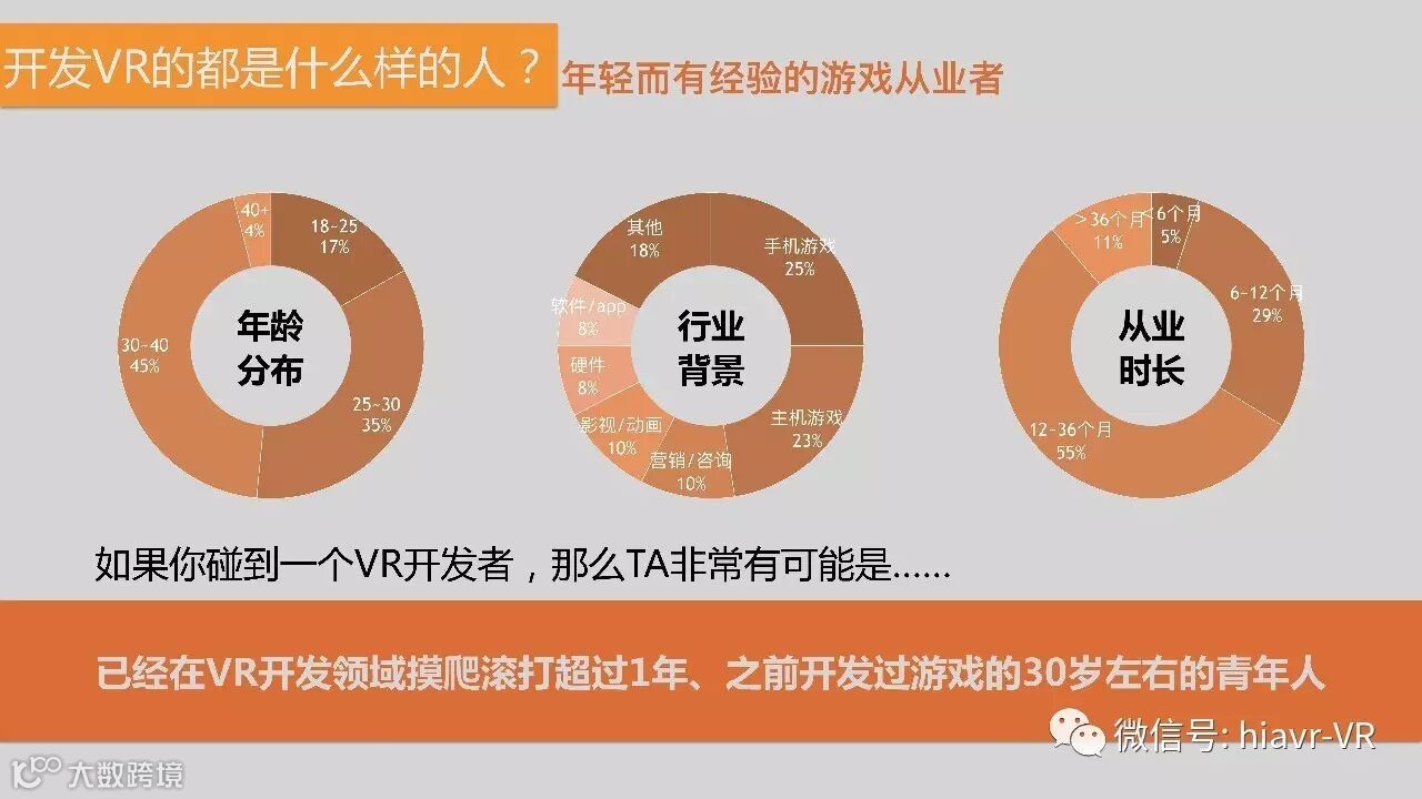 如果你碰到一个VR开发者,那么TA非常有可能是已经在VR开发领域摸爬滚打超过1年、之前开发过游戏的30岁左右的青年人
