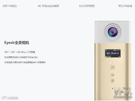 Eyesir可配合App使用,将全景视频输出为MP4格式,自带WIFI,在4K和2K之间进行切换。出入的全景视屏可在App上打开并设置VR模式。不过,想要有VR效果,用户需佩戴相应的VR头盔。
