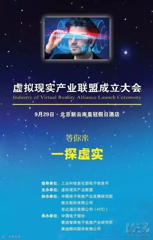 在工业和信息化部电子信息司指导下,由中国电子信息产业发展研究院、北京航空航天大学虚拟现实技术与系统国家重点实验室、歌尔股份有限公司和宏达通讯有限公司(HTC)等虚拟现实领域主要企业、研究机构联合发起的虚拟现实产业联盟(Industry of Virtual Reality Alliance,英文缩写IVRA)将于9月29日在北京新云南皇冠假日酒店举行成立大会。