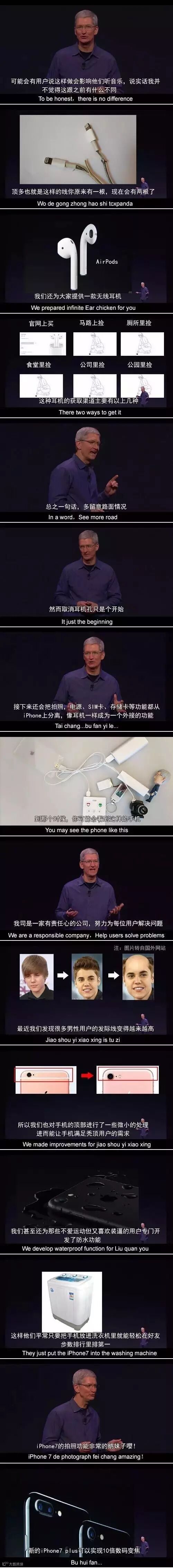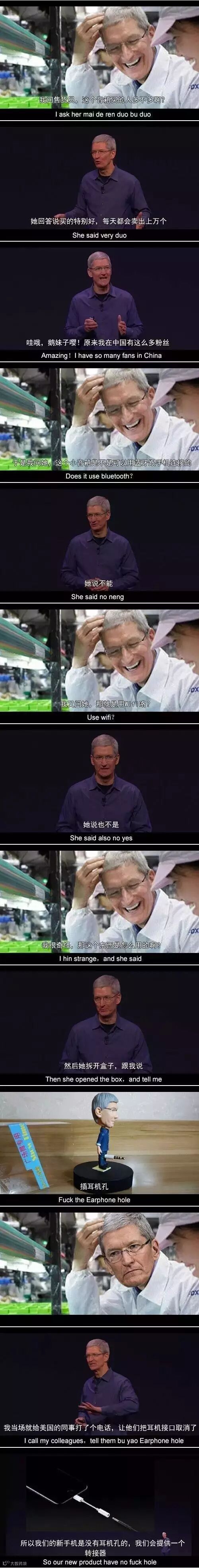 发布会后有位记者问库克,如果一个大学寝室里全部都用的苹果7,然后寝室比较乱,耳机经常搞错了,晚上熄灯后有人想听音乐,结果当他打开莫扎特一首钢琴曲时,结果左边的耳机在播放《最炫民族风》,右边的耳机在叫床,发生这种情况怎么办。库克回答,AirPods这种设计就是想让人们多接触点不同的文化。