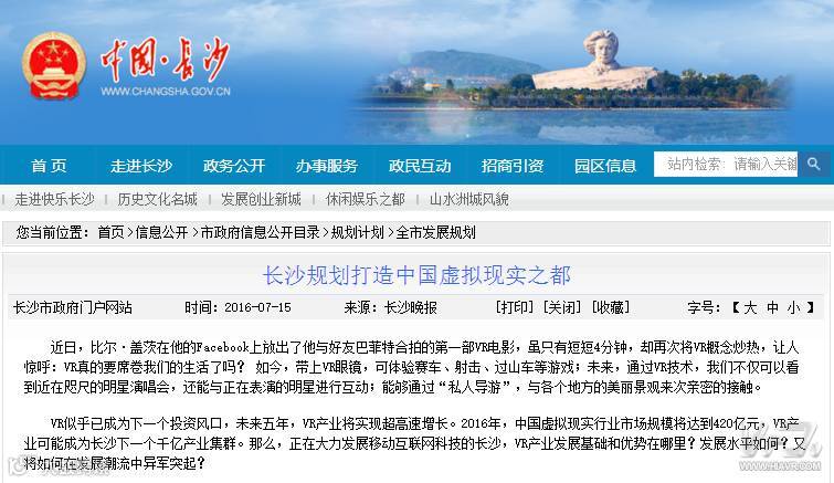 为更好地推动VR产业发展,长沙将成立VR产业联盟,抱团发展;成立VR产业基金,首期基金规模为30亿元;设立VR产业专项资金,资金规模每年1亿元,主要用于VR产业技术研发、平台建设、硬件设备生产和重大项目支持等。