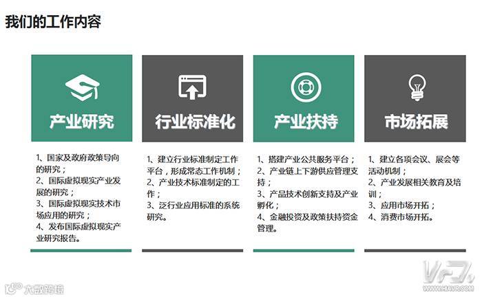 产业研究:国家及政府政策导向的研究、国际虚拟现实产业发展的研究、国际虚拟现实技术市场应用的研究、发布国际虚拟现实产业研究报告。