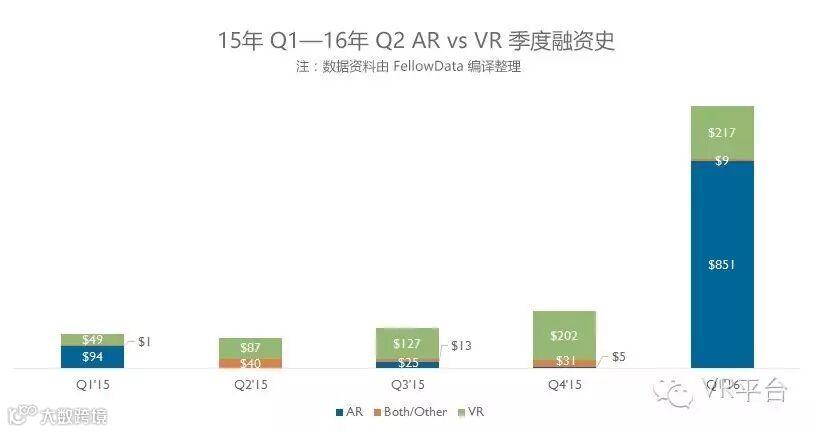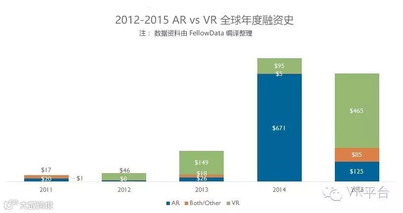 VR 融资额在 2015 年增长了 391%,从 9500 万美元猛增至 4.65 亿美元,而同年 AR 的融资额则大幅下滑了 81%,只有 1.25 亿美元。