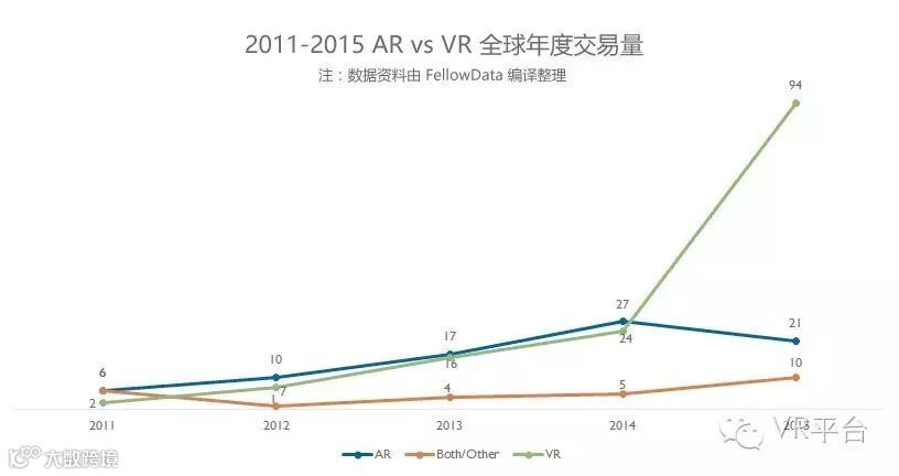 就投融资总量而言,VR 在 2015 年同样出现大幅增长。2014 年,VR 行业总共只完成了 24 笔交易,而2015 年则达到 94 笔,同比增长 292%。与此同时,AR 创业公司在 2015 年完成的投融资数量则同比下降了 22%。